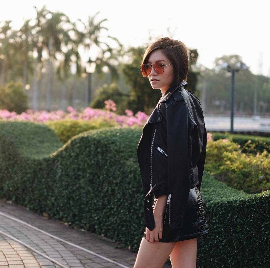 11. ชุดกระโปรงหนัง+แจ็คเก็ตหนังเบาๆ