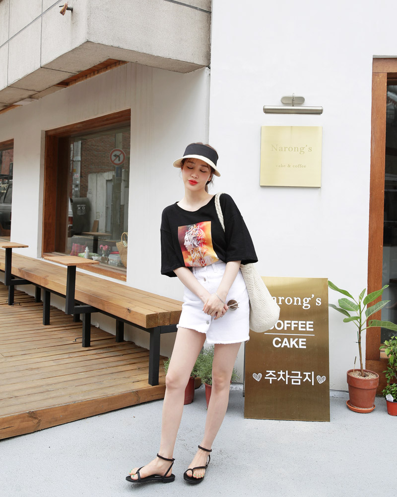 2.เสื้อยืดแฟชั่นโอเวอร์ไซส์แมทช์กระโปรงยีนส์สีขาวแอบเปรี้ยวซ่าทำงานแบบชิลชิล