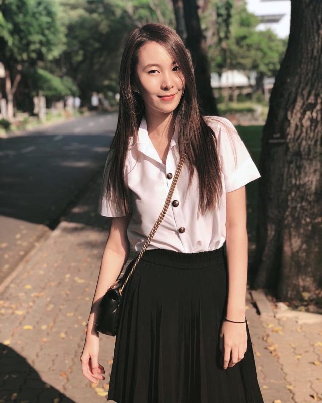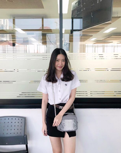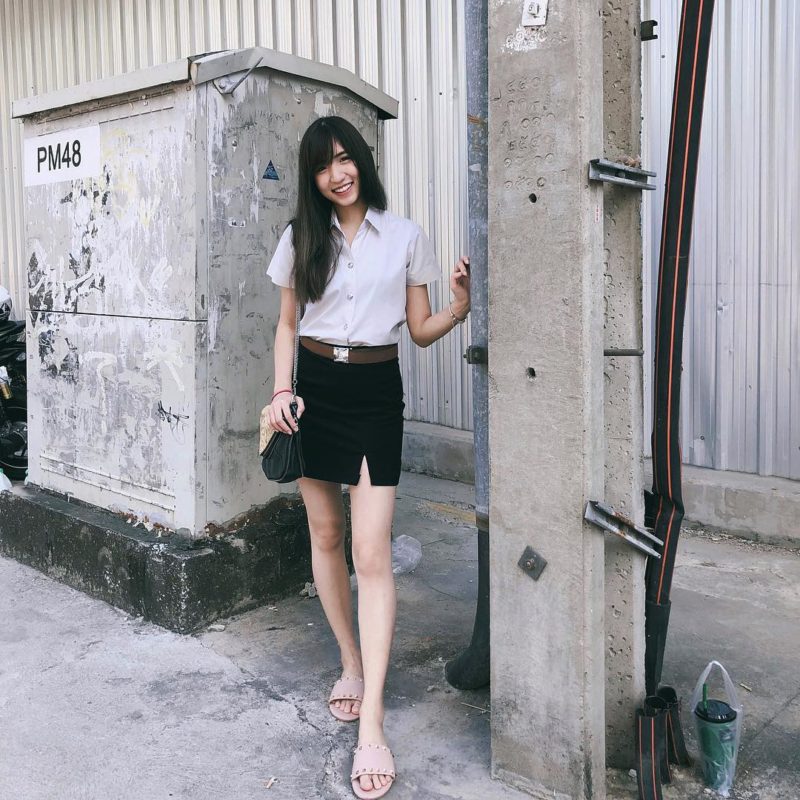 15.ลุคนักศึกษาธรรมดาๆ เพิ่มความเซอร์ด้วยกระโปรงทรงเอผ่าหน้า ไม่สั้นเกินไป
