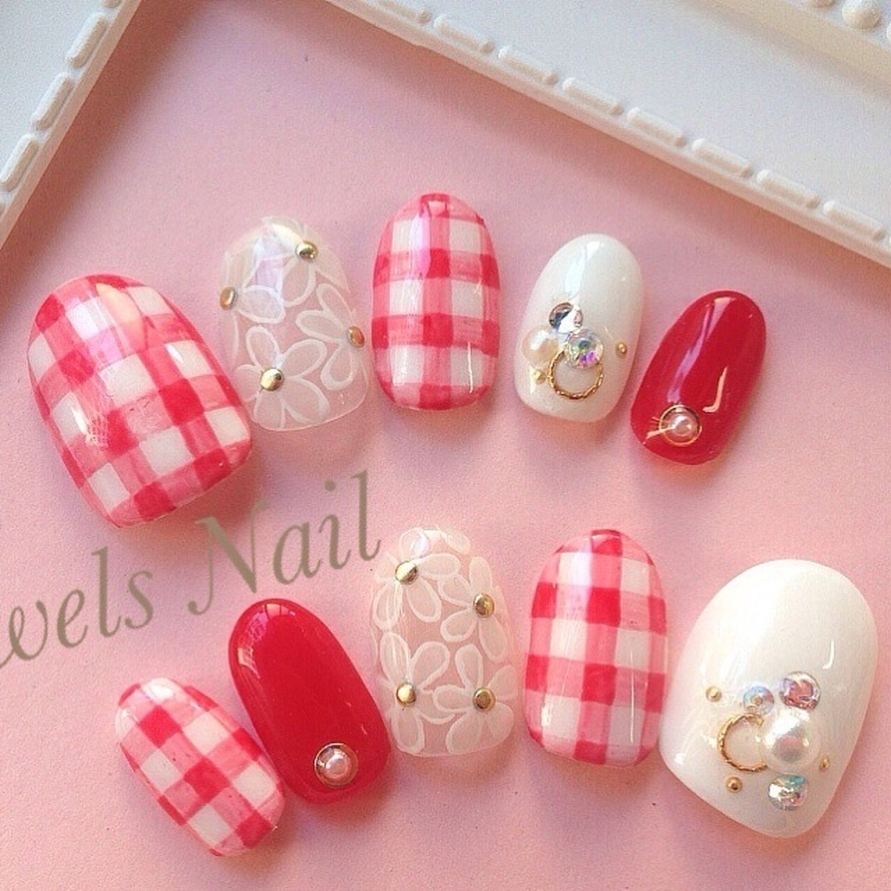 2. เล็บเจลลายสก๊อตขาวแดงกับดอกไม้สีขาว น่ารักอบอุ่นเหมือนได้ไปปิกนิก